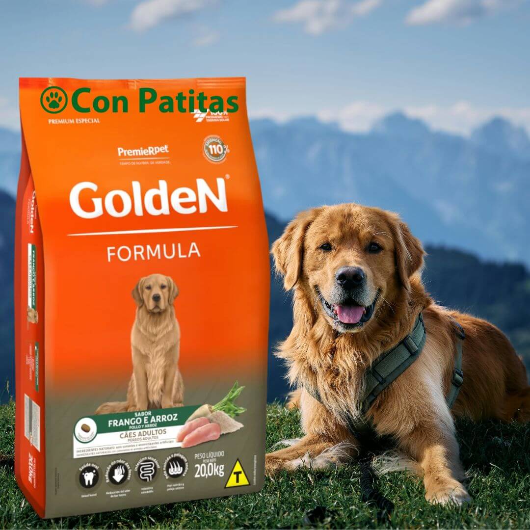 Golden Formula Adultos Pollo y Arroz es un alimento completo para perros adultos de la línea GoldeN Premium Especial. La fórmula está elaborada con ingredientes como harina de vísceras de pollo, maíz, arroz, afrecho de arroz, semillas de lino, pulpa de remolacha, grasas animales, extracto de yucca schidigera, hexametafosfato de sodio, vitaminas y minerales, buscando entregar una nutrición equilibrada para mantenimiento diario.