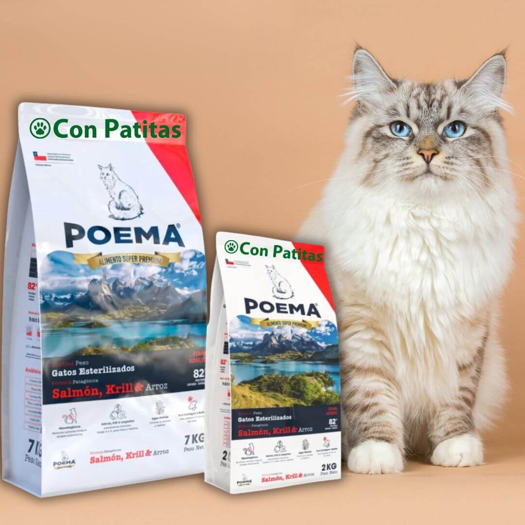 En Con Patitas Ecuador, te presentamos Poema Control Peso, la solución nutricional integral diseñada específicamente para gatos esterilizados adultos de todas las razas. Con los mejores precios del mercado ecuatoriano, este alimento hipoalergénico combina ingredientes premium del océano Patagónico con una fórmula científicamente formulada para prevenir la obesidad, controlar los niveles de glucosa en sangre y mantener a tu felino saludable, activo y en su peso ideal.